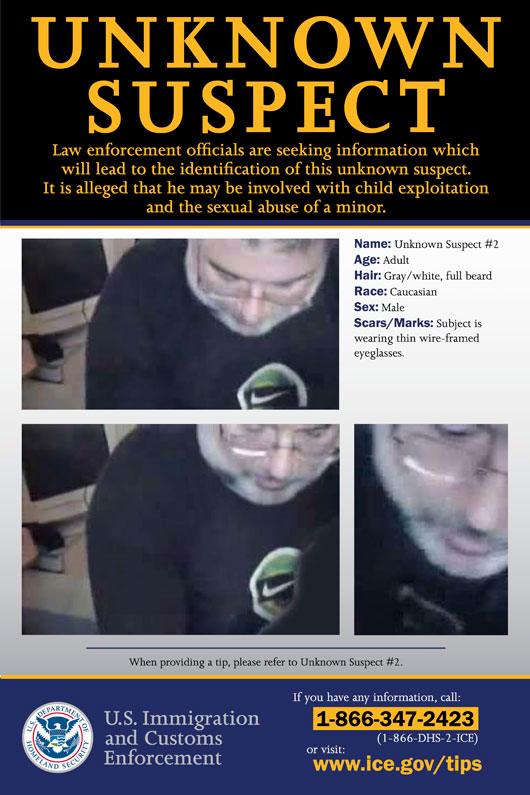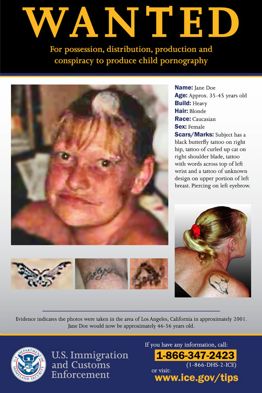 Η ICE έδωσε στη δημοσιότητα και τη φωτογραφία μιας γυναίκας κι ενός άνδρα που θεωρείται ύποπτος για την κακοποίηση του κοριτσιού. Και οι δυο καταζητούνται. Η γυναίκα έχει τατουάζ και οι ICE ελπίζει πως μέσω αυτών θα αναγνωστιστεί και να ανακαλύψουν την ταυτότητά τους.
