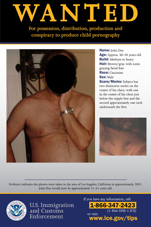 Ο διευθυντής της Υπηρεσίας, Τζον Μόρτον αποκάλυψε ότι έχει βγει ένταλμα σύλληψης και για δυο ενήλικες, στους οποίους οι αρχές του Λος Άντζελες έχουν απαγγείλει κατηγορίες για κακοποίηση ενός κοριτσιού. Στις φωτογραφίες που «ανέβηκαν» στο internet το κορίτσι φαίνεται να ήταν 13 ετών όταν κακοποιήθηκε. Η εκτίμηση των αμερικανικών αρχών είναι πως η κακοποίηση έγινε πριν από 11 χρόνια.