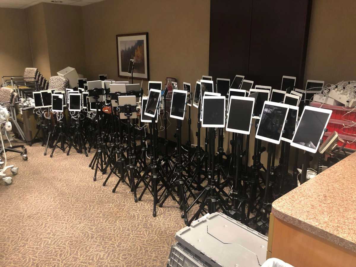 Μια εικόνα που αν δεν ξέρεις δείχνει απλά δεκάδες iPad, πάνω σε stands, στοιβαγμένα σε μια αίθουσα. Όταν όμως καταλάβει κανείς ότι βρίσκονται σε νοσοκομείο, έξω από τη ΜΕΘ και προορίζονται για να πουν συγγενείς το τελευταίο αντίο στους ανθρώπους τους που πεθαίνουν από covid-19, τότε και ο πιο δυνατός, λυγίζει.
