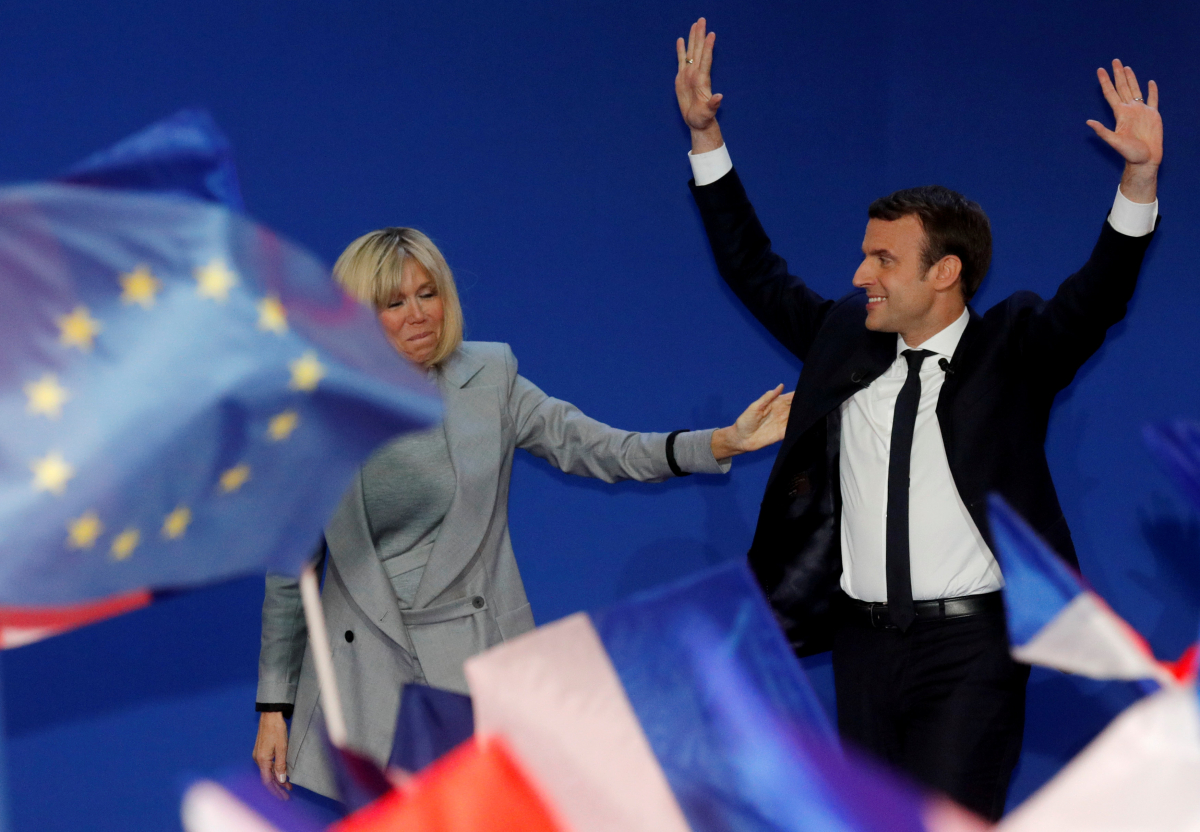Το βράδυ της Κυριακής, μετά την ανακοίνωση της πρόκρισής του στον δεύτερο γύρο των προεδρικών εκλογών, ο 39χρονος κεντρώος υποψήφιος ανεβαίνει στο βάθρο μπροστά στους οπαδούς του, χέρι χέρι με τη γυναίκα του, την Μπριζίτ, μια κομψή λεπτή ξανθιά με μπλε μάτια, 63 ετών.