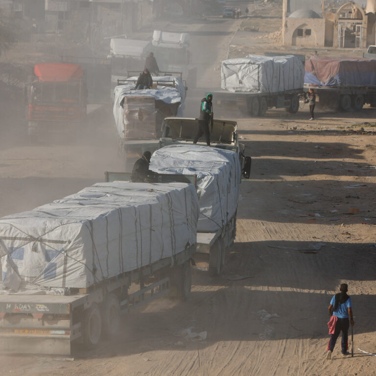 Προχθές Κυριακή, πρώτη ημέρα εφαρμογής της συμφωνίας κατάπαυσης του πυρός, ο ΟΗΕ έκανε λόγο για την είσοδο 630 φορτηγών, τα 300 από τα οποία είχαν προορισμό το βόρειο τμήμα της Λωρίδας της Γάζας, καθώς οι 2 και πλέον εκατομμύρια κάτοικοι του μικρού παλαιστινιακού θυλάκου είναι αντιμέτωποι με καταστροφική ανθρωπιστική κατάσταση.
