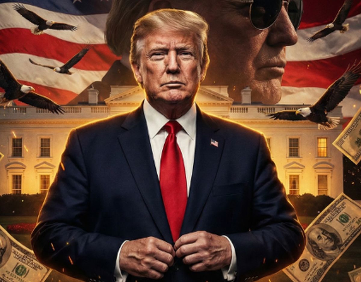 Στο κέντρο δεσπόζει ο Ντόναλντ Τραμπ, ντυμένος με σκούρο κοστούμι και κόκκινη γραβάτα, σε στάση αποφασιστικότητας. Πίσω του απλώνεται ο Λευκός Οίκος, φωτισμένος, ενώ η αμερικανική σημαία κυματίζει στο φόντο. Γύρω από τη σύνθεση εμφανίζονται αετοί, χαρτονομίσματα δολαρίων και έντονα χρυσά γραφικά, που παραπέμπουν σε ισχύ, πλούτο και εθνική υπεροχή. Στο κάτω μέρος της εικόνας δεσπόζει ο τίτλος «ONE YEAR OF MAGA», με χρυσά, επιβλητικά γράμματα, ενισχύοντας το αίσθημα θριάμβου και επετείου.