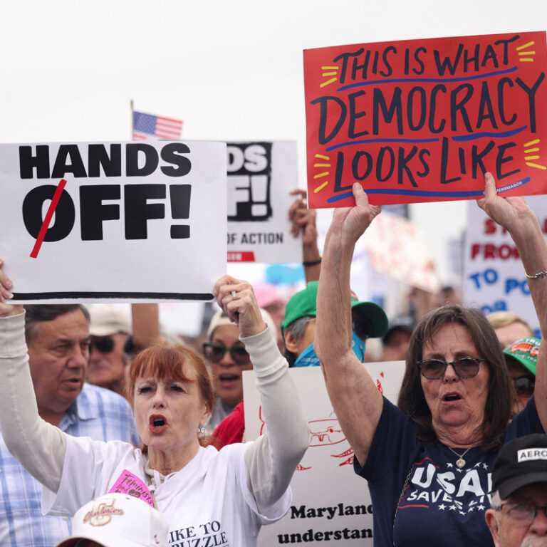 People participate in a protest on the New York Public Library steps near Bryant Park, in a demonstration that is part of larger "Hands off" events organized nationwide against U.S. President Donald Trump, in New York City, New York, U.S., April 5, 2025. REUTERS