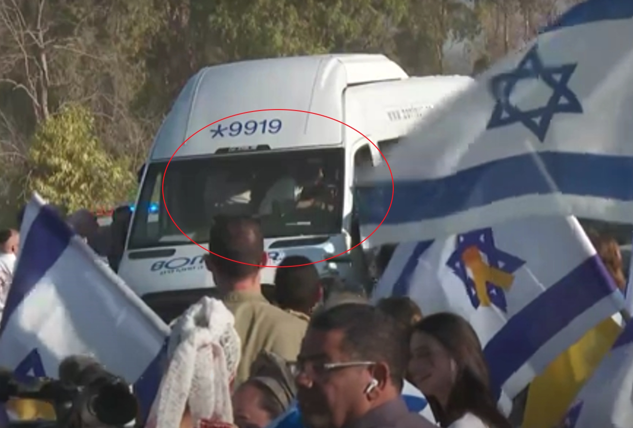 Η πρώτη εικόνα ομήρου που μεταφέρεται με βαν στη βάση Ρεΐμ. Ο άνδρας άρχισε να χαιρετά μέσα από το όχημα ενθουσιασμένος όσους βρέθηκαν στο σημείο.