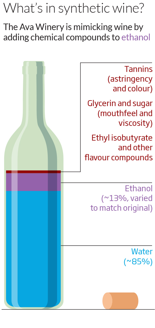 Η νεοσύστατη εταιρία από την Καλιφόρνια με έδρα το Σαν Φρανσίσκο, υποστηρίζει ότι έφτιαξε συνθετικό κρασί που δεν προέρχεται από σταφύλια, αλλά από αιθανόλη και άλλες αρωματικές ουσίες και το οποίο -υποτίθεται ότι- έχει γεύση κρασιού.