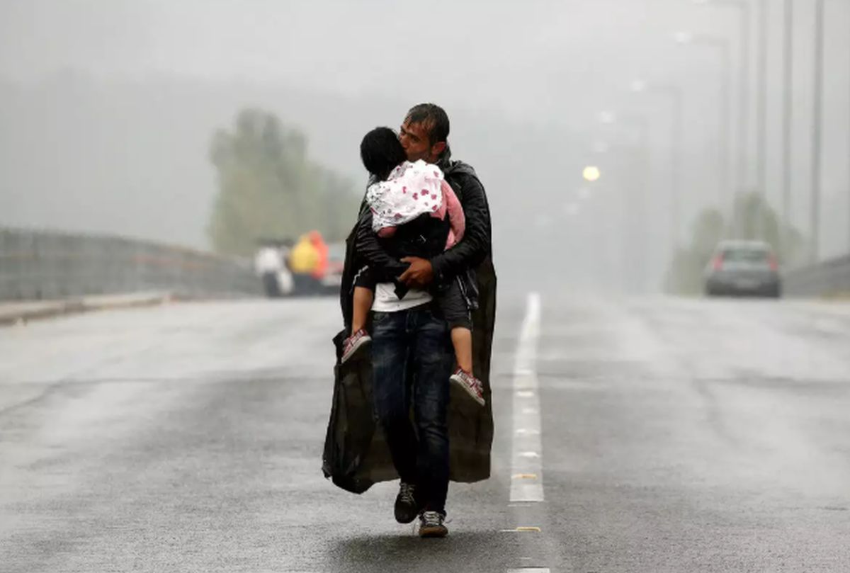 Στην Ειδομένη, μέσα στη βροχή και στην αβεβαιότητα, ένας πατέρας κρατά στην αγκαλιά την κόρη του, τυλιγμένος μόνο με μία σκουπιδοσακούλα για προστασία. Περπατούν προς τα σύνορα, μέσα στη λάσπη και το χάος της προσφυγικής κρίσης.