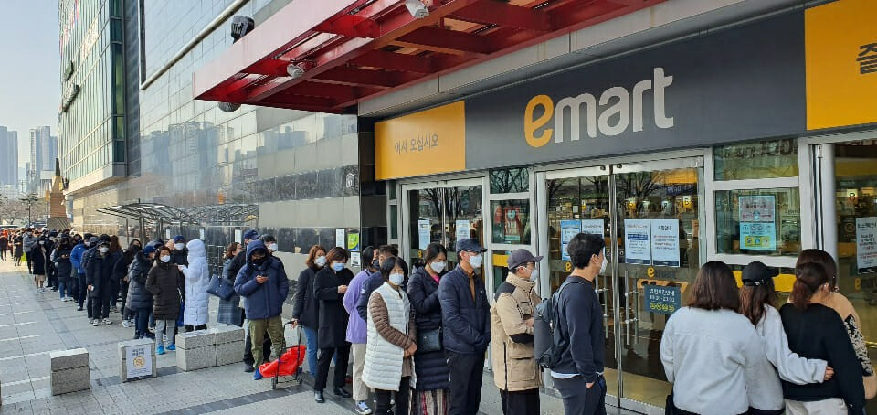 Οι πολίτες κάθονται ο ένας πίσω από τον άλλο, έξω από σούπερ μάρκετ στην Νταεγκού και περιμένουν υπομονετικά τη σειρά τους. Στη Νότια Κορέα υπάρχει ραγδαία αύξηση του αριθμού των κρουσμάτων, καθώς μέσα σε διάστημα μίας εβδομάδας καταγράφηκαν περισσότερα από 700 νέα κρούσματα .