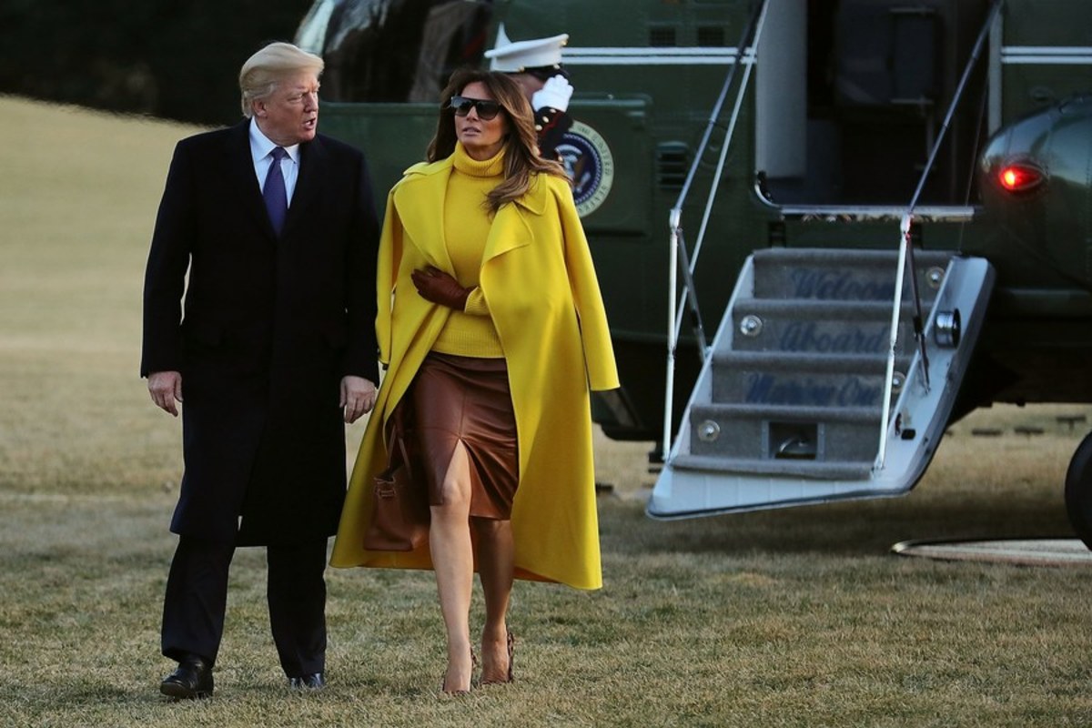 Εκείνη φορά μια ταμπά δερμάτινη φούστα ως το γόνατο, φυσικά ψηλοτάκουνες γόβες, κίτρινο πουλόβερ και κίτρινο παλτό. Περπατούν στο γρασίδι προς το ελικόπτερο με τους φωτογράφους να απαθανατίζουν κάθε τους στιγμή.