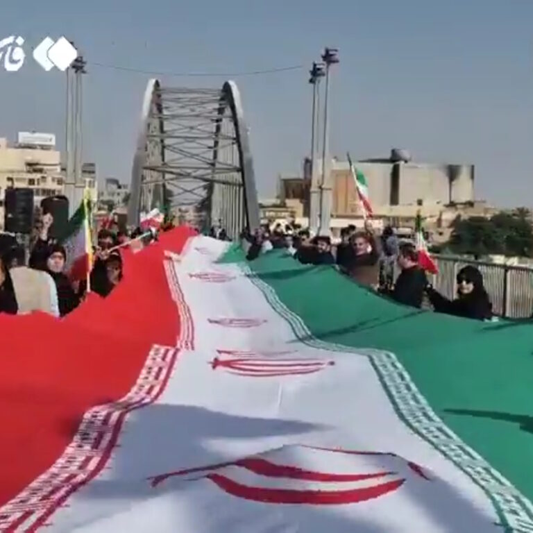 Ένα βίντεο που μοιράστηκε το πρακτορείο ειδήσεων Fars έδειχνε ανθρώπους να κρατούν μια μεγάλη ιρανική σημαία πάνω από την εμβληματική Πολ Σεφίντ, μια αψιδωτή γέφυρα στην Αχβάζ, στο νοτιοδυτικό Ιράν.