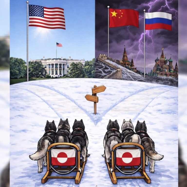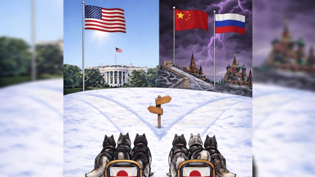 «Ποιον δρόμο θα διαλέξεις Γροιλανδέ;», γράφει η λεζάντα στην ανάρτηση του Λευκού Οίκου, που φαίνονται δύο έλκηθρα που τα σέρνουν τρία σκυλιά να πρέπει να διαλέξουν σε δύο διαδρομές που η πρώτη καταλήγει σε μία αμερικανική σημαία με φωτεινό καθαρό ουρανό και η δεύτερη σε δύο σημαίες της Κίνας και της Ρωσίας, που συνοδεύονται από καταιγίδα και αστραπές.