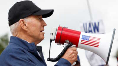 Ο Τζο Μπάιντεν σε διαδήλωση απεργών αυτοκινητοβιομηχανίας στο Μίσιγκαν με ντουντούκα στο χέρι