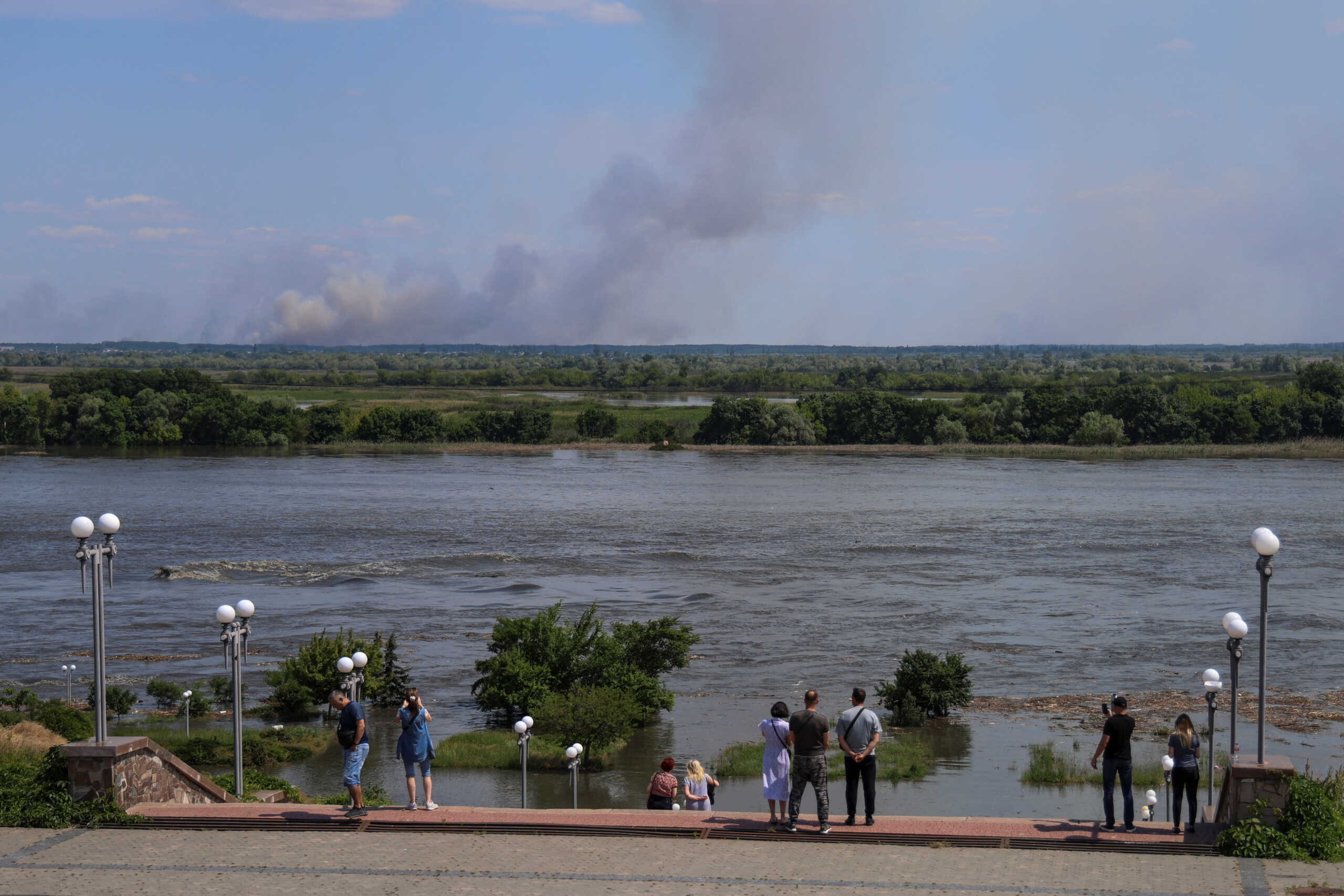 Local residents stand on an embankment of the Dnipro river which flooded after the Nova Kakhovka dam breached as smoke rises after shelling on the opposite bank, amid Russia's attack on Ukraine, in Kherson, Ukraine June 6, 2023. REUTERS