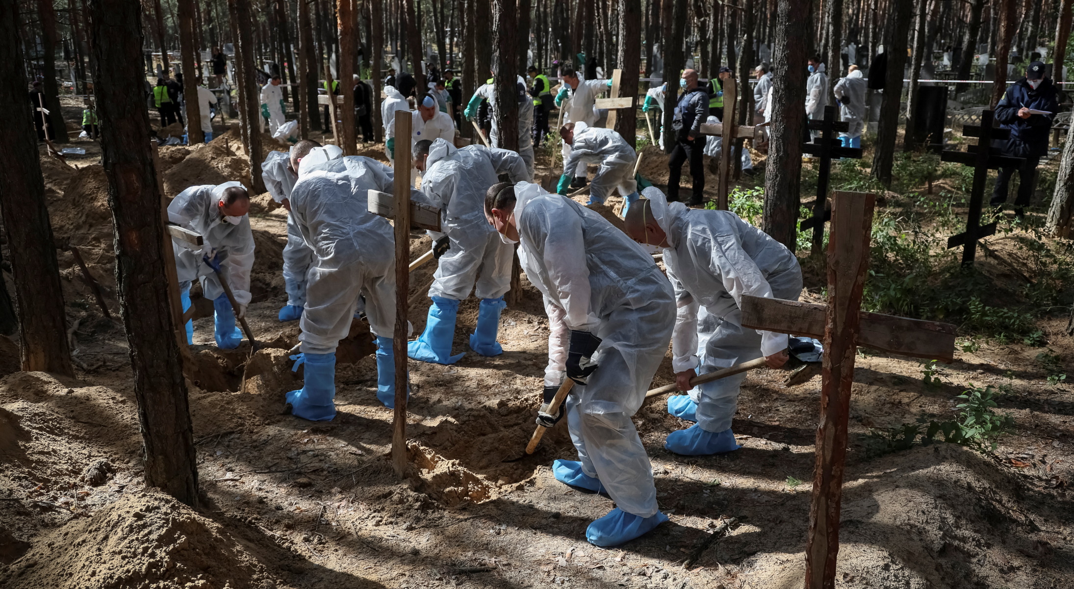 Σύμφωνα με τον Ουκρανό πρόεδρο, Βολοντίμιρ Ζελένσκι πιστεύεται ότι στην τοποθεσία αυτή, σε ένα δάσος στα περίχωρα του Ιζιούμ, έχουν ταφεί 450 άνθρωποι. Το Ιζιούμ ανακαταλήφθηκε πρόσφατα από τις ουκρανικές δυνάμεις, όταν εξαπέλυσαν αντεπίθεση στην περιφέρεια του Χαρκόβου.
