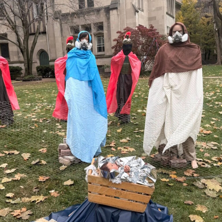 Η Lake Street Church of Evanston στο Σικάγο δημιούργησε φέτος μια φάτνη εμπνευσμένη από επιχειρήσεις της Υπηρεσίας Μετανάστευσης και Τελωνειακής Επιβολής των ΗΠΑ, γνωστής ως ICE, με τη μορφή της Παναγίας να φοράει αντιασφυξιογόνα μάσκα, για προστασία από τα δακρυγόνα, και το Θείο Βρέφος να εμφανίζεται με δεμένα τα χέρια, τυλιγμένο με μια κουβέρτα παρόμοια με αυτές που χρησιμοποιούνται στα κέντρα κράτησης.