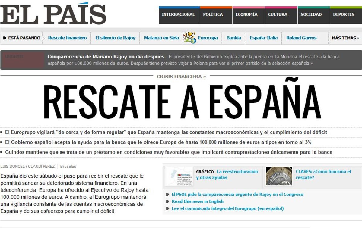 “Σωτηρία για την Ισπανία”: Ο τίτλος στην πρώτη σελίδα της κεντροαριστερής εφημερίδας El Pais συνoψίζει σήμερα την έκπληξη του ισπανικού Τύπου, που επιμένει στο γεγονός ότι η χώρα, αφού αρνήθηκε για αρκετό καιρό, υποχώρησε και ζήτησε ευρωπαϊκή βοήθεια για τις τράπεζές της.