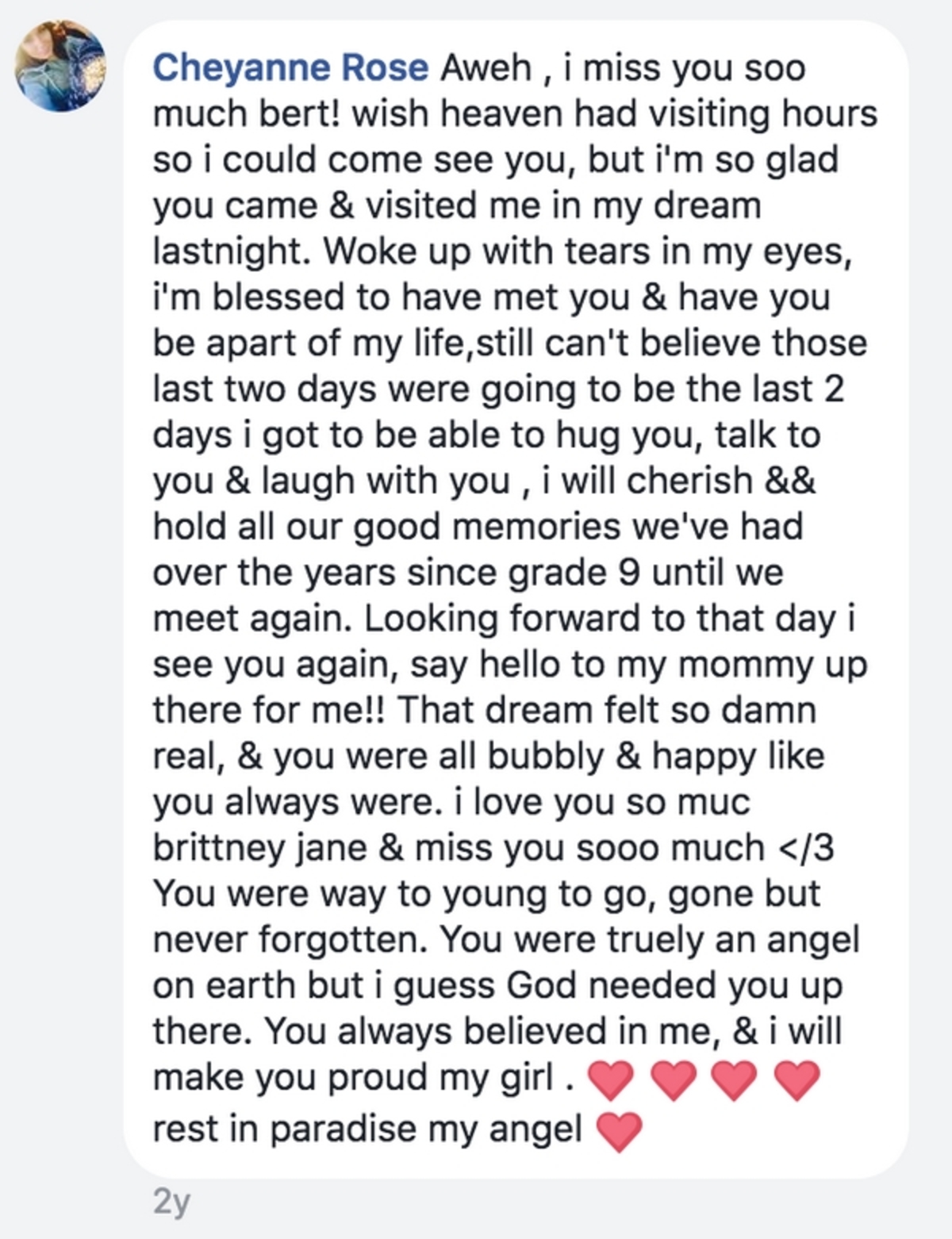 “Μου λείπεις τόσο πολύ! Εύχομαι να μπορούσα να σε δω αλλά είμαι τόσο χαρούμενη που με επισκέφθηκες στο όνειρό μου. Ξύπνησα με δάκρυα. Είμαι ευλογημένη που σε γνώρισα και ήσουν μέρος της ζωής μου. Ακόμα δεν μπορώ να πιστέψω εκείνες τις δύο μέρες που έμελλε να είναι οι τελευταίες που μπορούσε να σε αγκαλιάσω, να σου μιλήσω και να γελάσω μαζί σου” είχε σχολιάσει κάτω από τη selfie τους η Cheyanne.