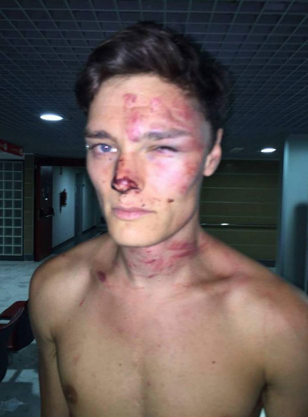 Φαίνεται ότι οι σεκιουριτάδες προχώρησαν στην επίθεση αφού η Αγγλίδα τους “είχε πετάξει ένα πλαστικό ποτήρι” για λόγους που δεν γίνονται γνωστοί. Το προσωπικό ασφαλείας, όπως είναι εμφανές και από το βίντεο επιτίθεται με ιδιαίτερη βιαιότητα στον Άγγλο, ο οποίος όπως μπορείτε να δείτε και στη φωτογραφία του μετά το επεισόδιο, αποκόμισε αρκετούς μώλωπες στο πρόσωπο.