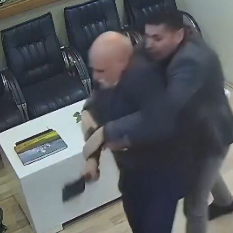 Το περιστατικό καταγράφηκε σε βίντεο, στο οποίο φαίνεται η άμεση αντίδραση τριών συναδέλφων του υπαλλήλου, οι οποίοι προσέγγισαν τον δράστη και με ήρεμο τρόπο κατάφεραν να τον πείσουν να καθίσει, πριν τα πράγματα γίνουν χειρότερα.