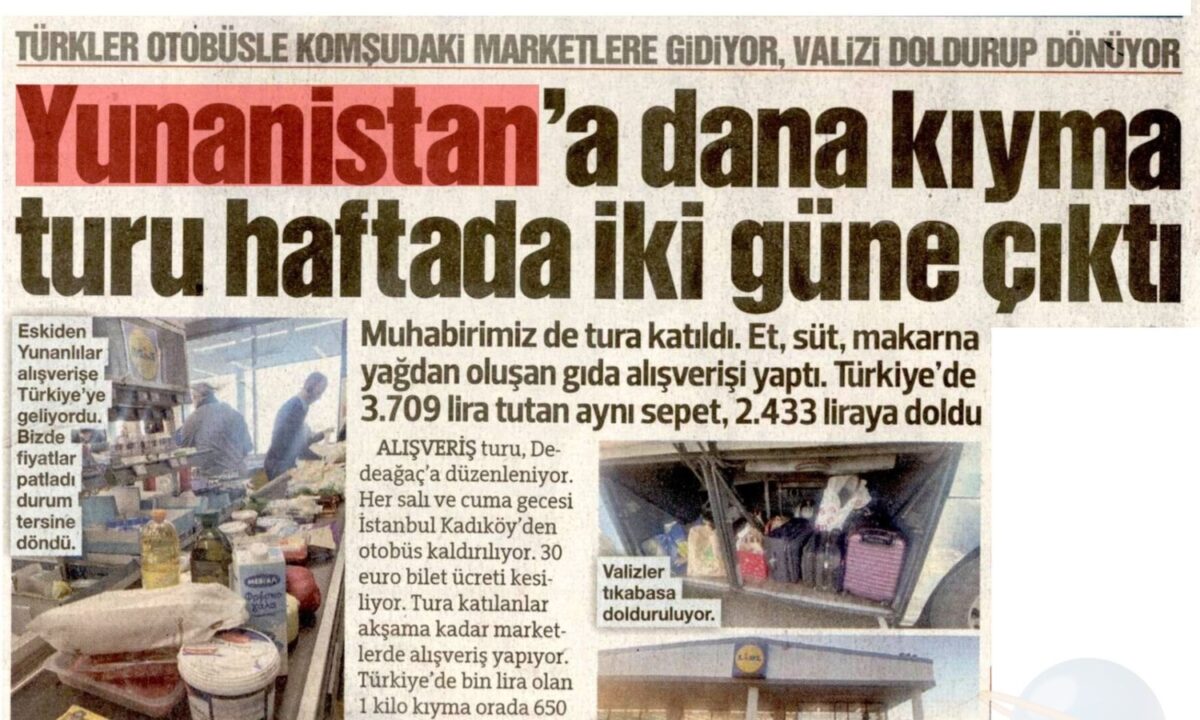 Όπως γράφει η εφημερίδα Sοzcu, οι Τούρκοι παίρνουν το λεωφορείο, περνούν τα σύνορα με την Ελλάδα και ψωνίζουν από τα ελληνικά σούπερ μάρκετ. Οι ίδιες πληροφορίες αποκαλύπτουν πως ένα καλάθι κόστους 3.709 λίρες στην Τουρκία, στην Ελλάδα κοστίζει μόνο 2.433 λίρες.