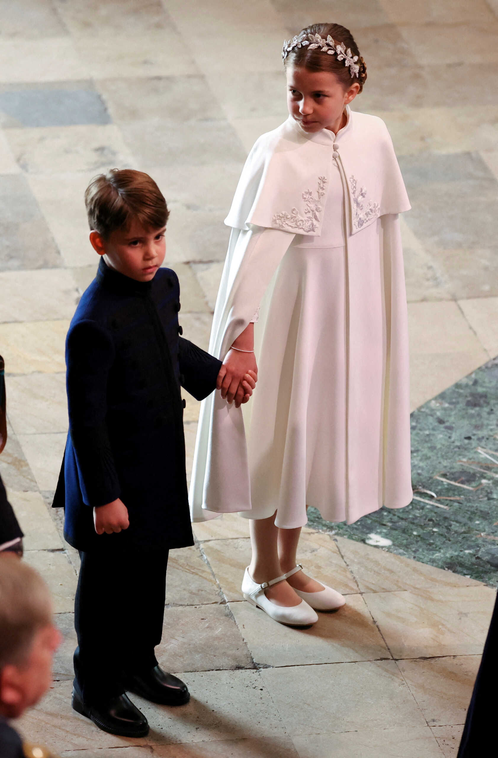 Πρίγκιπας Λούις και πριγκίπισσα Σάρλοτ, μπήκαν χέρι – χέρι στο Αββαείο του Γουέστμινστερ, ακολουθώντας τους γονείς τους και στη συνέχεια κάθισαν σε διπλανές θέσεις.