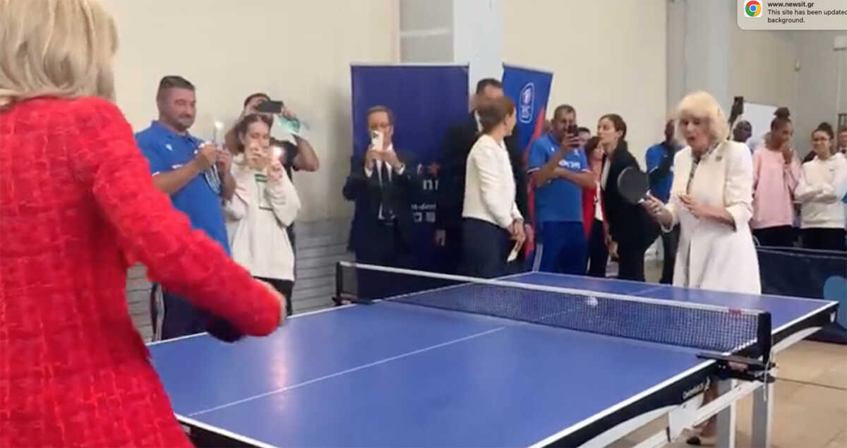 Δεν βλέπει κανείς κάθε μέρα μια Βασίλισσα και μια Πρώτη Κυρία να παίζουν πινγκ πονγκ. Αυτό έγινε σήμερα στο Σεν Ντενί στο Παρίσι όταν κατά την επίσκεψη στο χωριό του Παγκοσμίου Κυπέλου Ράγκμπι η Βασίλισσα Καμίλα και η Μπριζίτ Μακρόν βλέποντας ένα τραπέζι του πινγκ πονγκ πήραν από μια ρακέτα και άρχισαν να παίζουν.