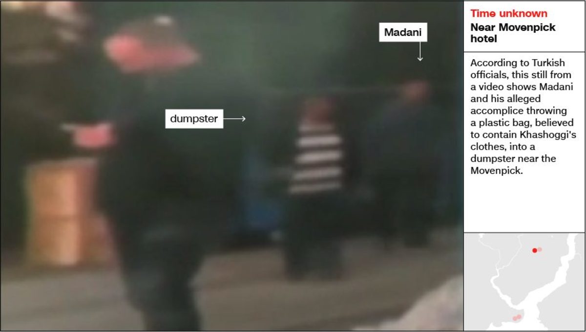 Το video που εξασφάλισε το CNN είναι μέρος της έρευνες που διεξάγουν οι τουρκικές αρχές για την πολύκροτη υπόθεση. Ο άνδρας αυτός αναγνωρίστηκε ως ο Μουσταφά αλ Μαντάνι. Θεωρείται μέλος της ομάδας κρούσης που στάλθηκε στην Κωνσταντινούπολη για να δολοφονήσει τον αντιφρονούντα δημοσιογράφο.