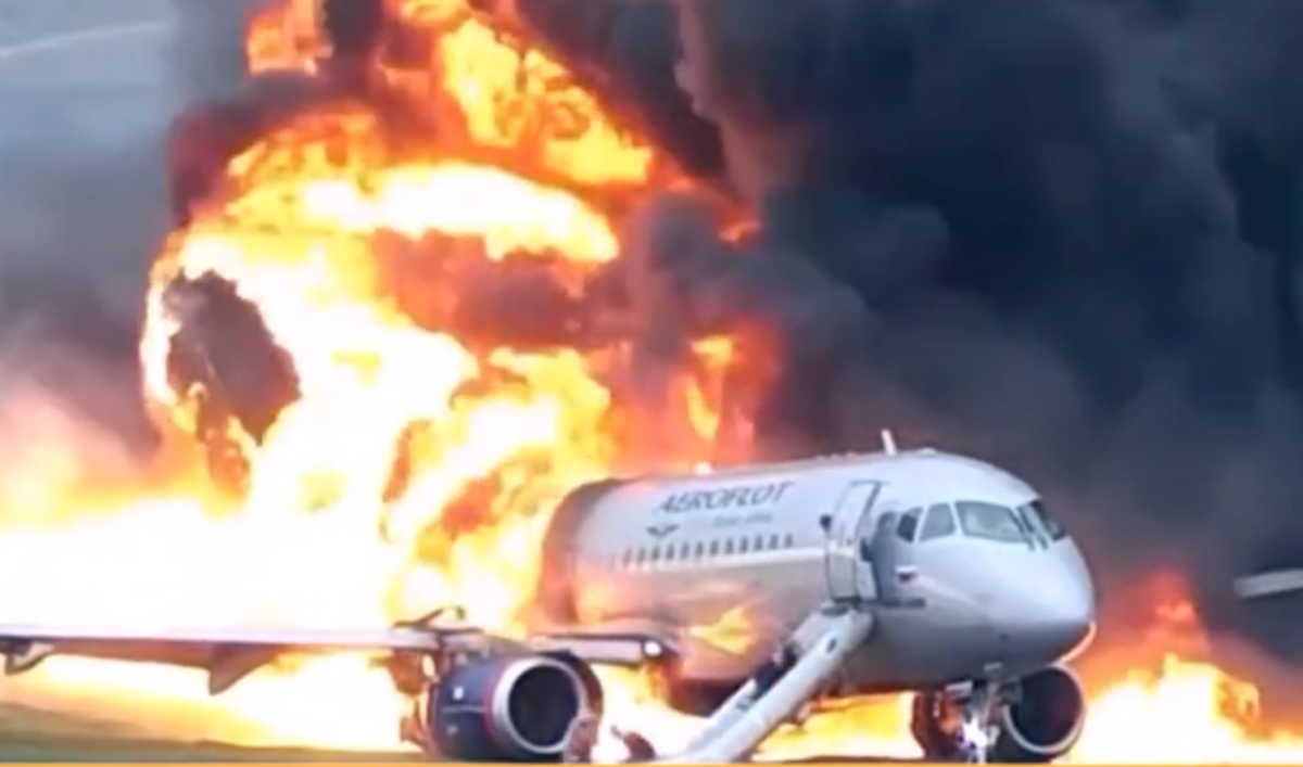 Ένα βίντεο από τη στιγμή που το φλεγόμενο αεροπλάνο σέρνεται στον διάδρομο προσγείωσης σε αεροδρόμιο της Μόσχας είδε τη δημοσιότητα.