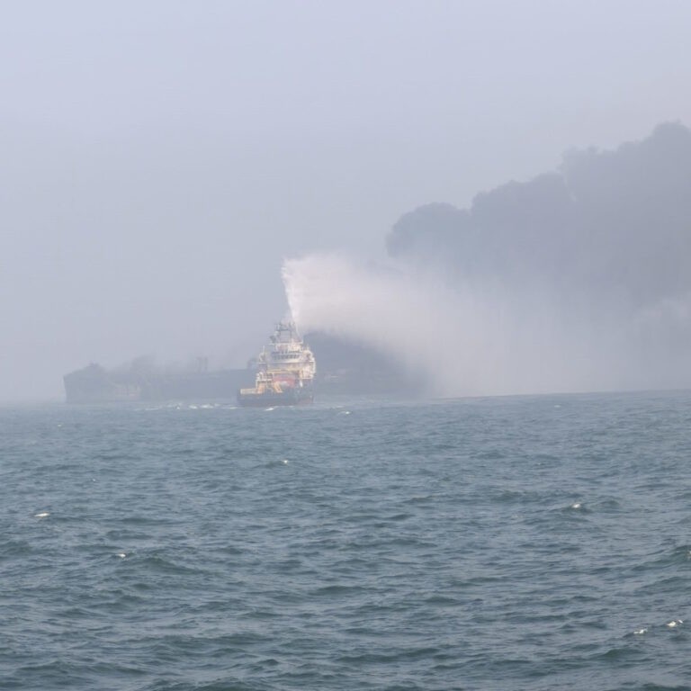 «Ξέσπασε φωτιά ως αποτέλεσμα της σύγκρουσης και υπάρχουν αναφορές για διαρροή πετρελαίου», συνέχισε η αμερικανική εταιρεία. Σύμφωνα με αυτήν, το πλήρωμα εκκένωσε το δεξαμενόπλοιο μετά από «πολλαπλές εκρήξεις». Όλα τα μέλη του είναι «ασφαλή και υγιή», τόνισε.