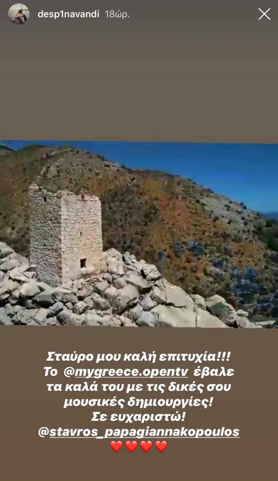 Συγκεκριμένα, ανήρτησε στα instastories της ένα απόσπασμα από το music video του «My Greece» και έγραψε χαρακτηριστικά: «Σταύρο μου καλή επιτυχία. Το My Greece έβαλε τα καλά του με τις δικές σου μουσικές δημιουργίες. Σε ευχαριστώ!» .