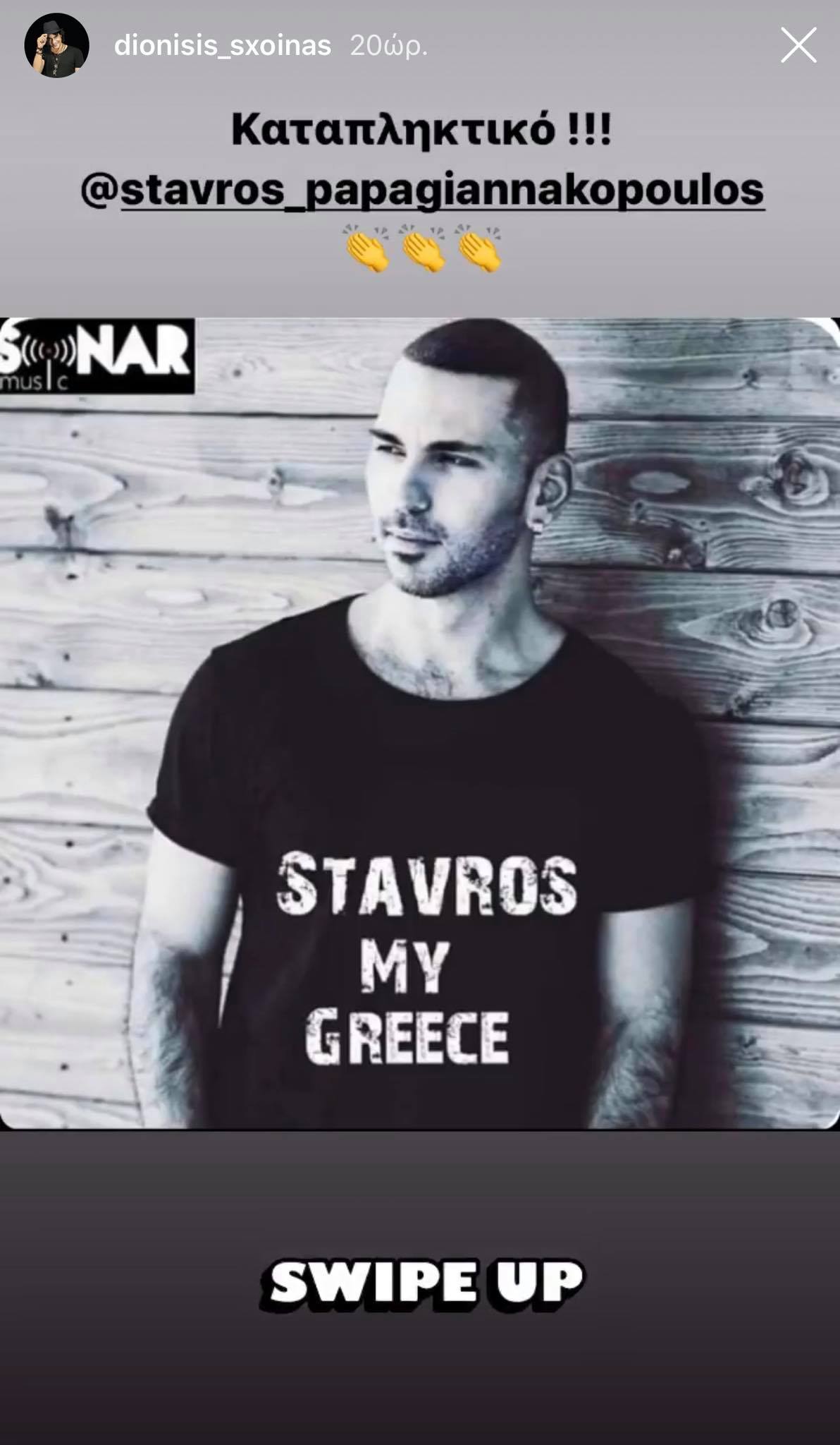 Αντίστοιχη ανάρτηση, όμως, έκανε και ο Διονύσης Σχοινάς, με τον οποίο συνεργάζεται επί χρόνια ο Starvos. «Καταπληκτικό!» σχολίασε ο τραγουδιστής στα instastories τους, όπου έκανε swipe up το «My Greece».