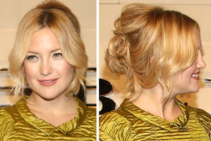 Κέιτ Χάντσον. Πιάνουμε τα σπαστά μαλλιά  όπως όπως αφού τα έχουμε στεγνώσει με πιστολάκι και τα στερεώνουμε με φουρκέτες και τσιμπιδάκια χωρίς να τα σφίγγουμε.Χρόνος :4 λεπτά!
