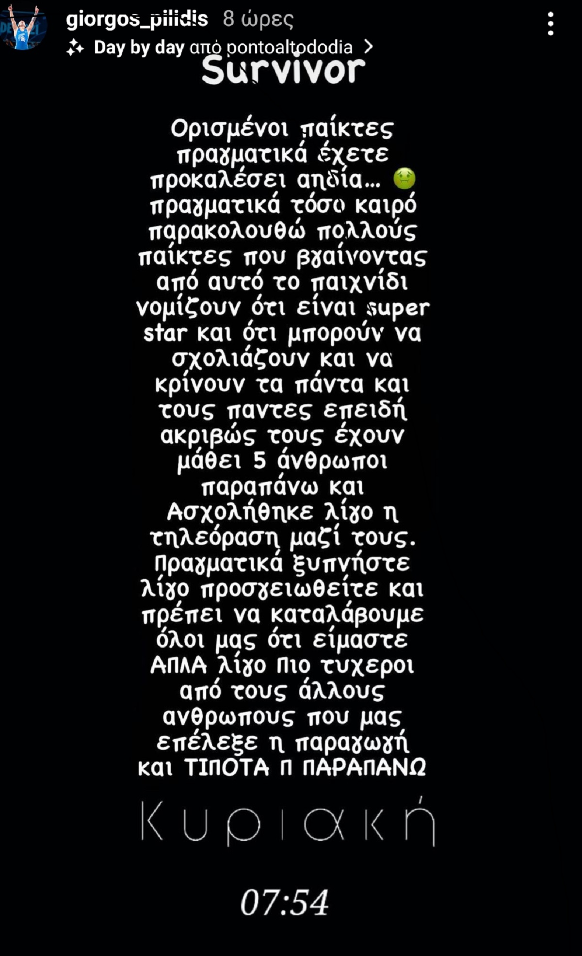 Ο Γιώργος Πιλίδης έγραψε στην ανάρτησή του: «Survivor… Ορισμένοι παίκτες πραγματικά έχετε προκαλέσει αηδία… Πραγματικά τόσο καιρό παρακολουθώ πολλούς παίκτες που βγαίνοντας από αυτό το παιχνίδι νομίζουν ότι είναι super star και ότι μπορούν να σχολιάζουν και να κρίνουν τα πάντα και τους πάντες επειδή ακριβώς τους έχουν μάθει 5 άνθρωποι παραπάνω και ασχολήθηκε λίγο η τηλεόραση μαζί τους.