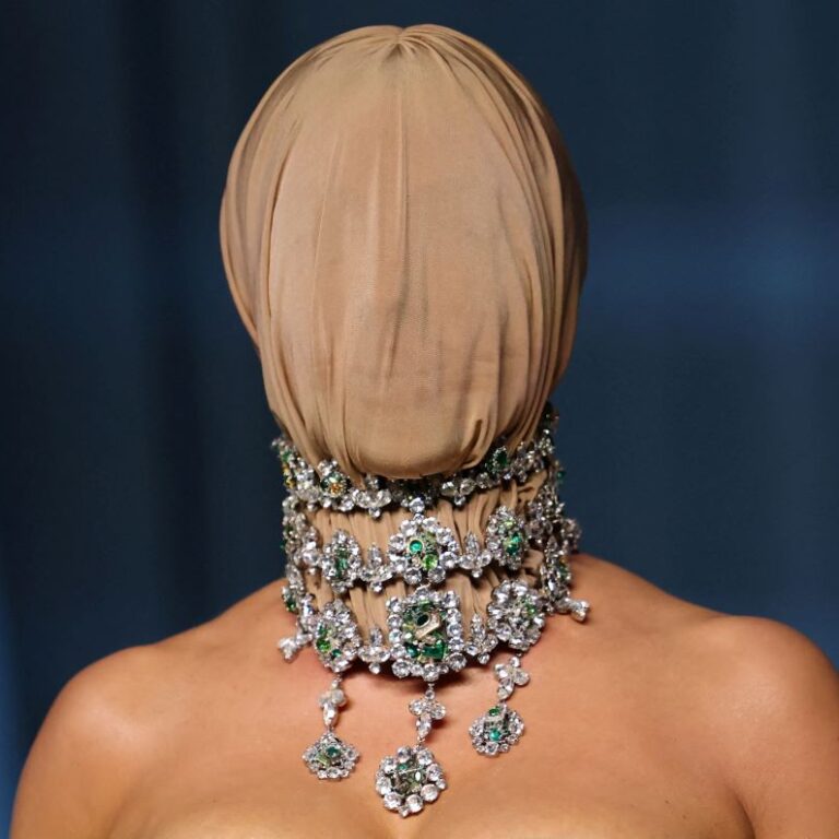 Η μάσκα κάλυπτε ολόκληρο το κεφάλι και τα μαλλιά της, καθώς ποζάρε για τους φωτογράφους με φόρεμα Maison Margiela με ενσωματωμένο κορσέ.