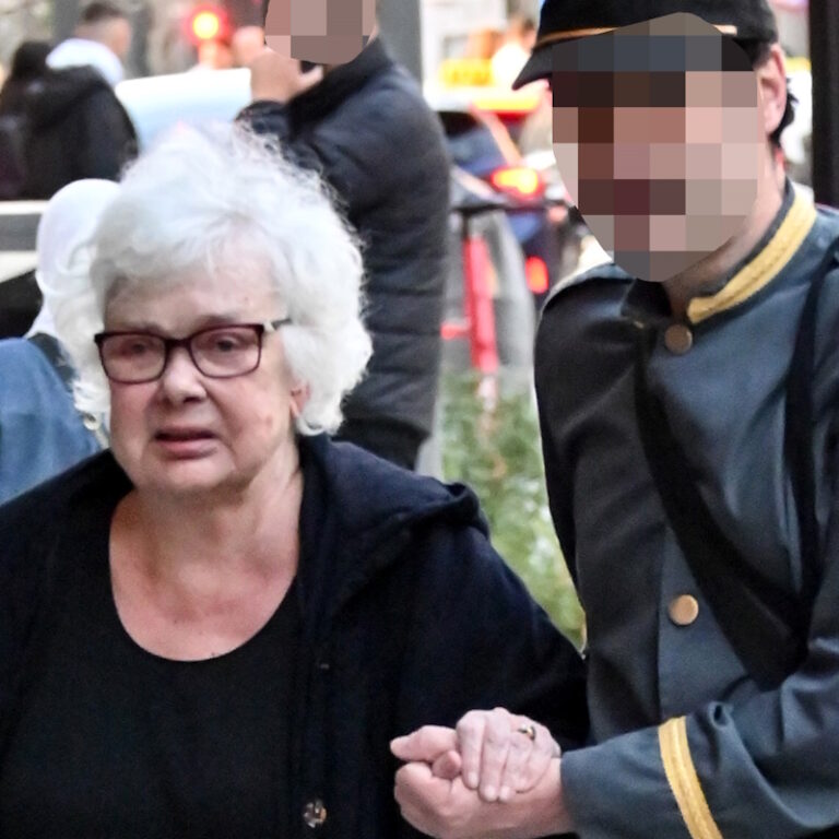 Η Ξένια Καλογεροπούλου ήταν ντυμένη στα μαύρα και περπατούσε με τη βοήθεια του μπαστουνιού της, ενώ ένας άντρας τη συνόδευε στη βόλτα της στο κέντρο.