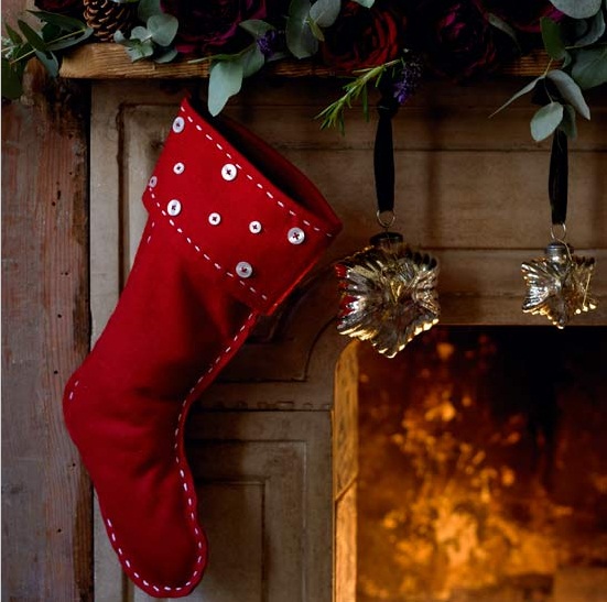 Η Χριστουγεννιάτικη κάλτσα! Μία παράδοση που αγαπούν τα παιδιά όλου του κόσμου αλλά και οι μεγάλοι! Μπορείς να την φτιάξεις μόνη σου! Μία ωραία ιδέα είναι αυτή της φωτογραφίας, που μπορείς να της δώσεις λάμψη ράβοντας επάνω της ασημί ή χρυσά κουμπάκια! Αν υπάρχει τζάκι είναι το καλύτερο σημείο για να την τοποθετήσεις!