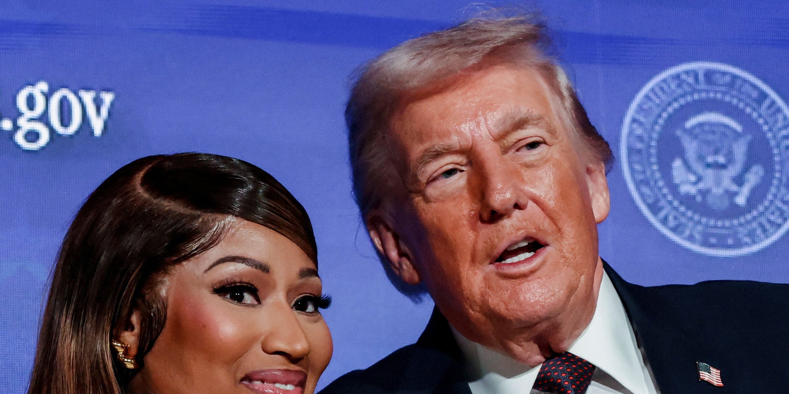 Κατά τη διάρκεια της εκδήλωσης, ο Τραμπ κράτησε το χέρι της ράπερ μπροστά στο κοινό και δεν δίστασε να αστειευτεί για το χαρακτηριστικό, υπερβολικό μανικιούρ της, λέγοντας πως θα ήθελε να «μακρύνει τα νύχια του για να της μοιάσει».