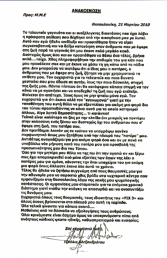 Μετά από τη δήλωση του δικηγόρου του πατέρα της Τζούλιας, Δημήτρη Κατωπόδη, που έλεγε αν η Τζούλια θέλει μπορεί να αλλάξει όνομα και να βρει κανένα καινούριο ώστε να μη λέγεται Αλεξανδράτου, η άτακτη ξανθιά θέλησε να απαντήσει μάλλον εξοργισμένη, μέσα από την παρακάτω ανακοίνωση: