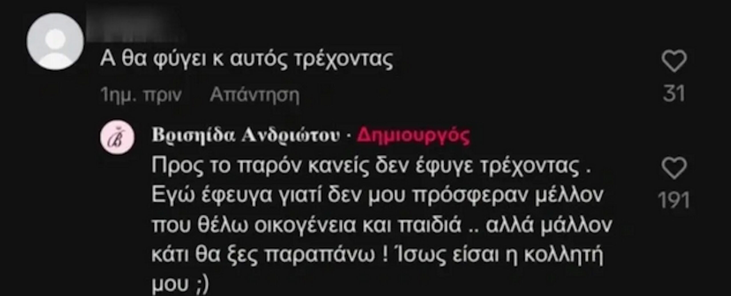 «Κανείς δεν έφυγε τρέχοντας» απάντησε η Βρισηίδα Ανδριώτου κάτω από το σχόλιο που διάβασε