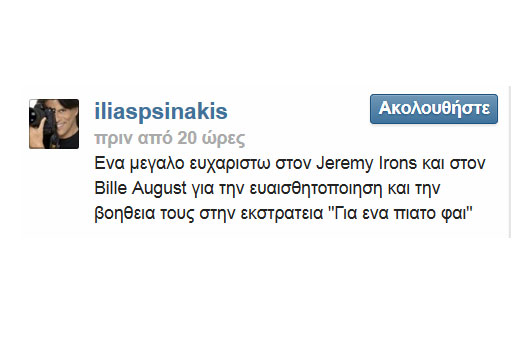 Χαρακτηριστικό είναι και το δημόσιο «ευχαριστώ» του Ψινάκη στον Άιρονς, αλλά και στο σκηνοθέτη της ταινίας Μπίλε Όγκουστ μέσα από τα social media όπου έγραψε «Ένα μεγάλο ευχαριστώ στον Jeremy Irons και στον Bille August για την ευαισθητοποίηση και την βοήθειά τους στην εκστρατεία “Για ένα πιάτο φαΐ”».