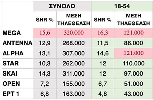 Κάνοντας μια πρώτη αποτίμηση για την Τετάρτη 1η Μαρτίου η κατάταξη των καναλιών σύμφωνα με τους τηλεθεατές είναι η εξής:
