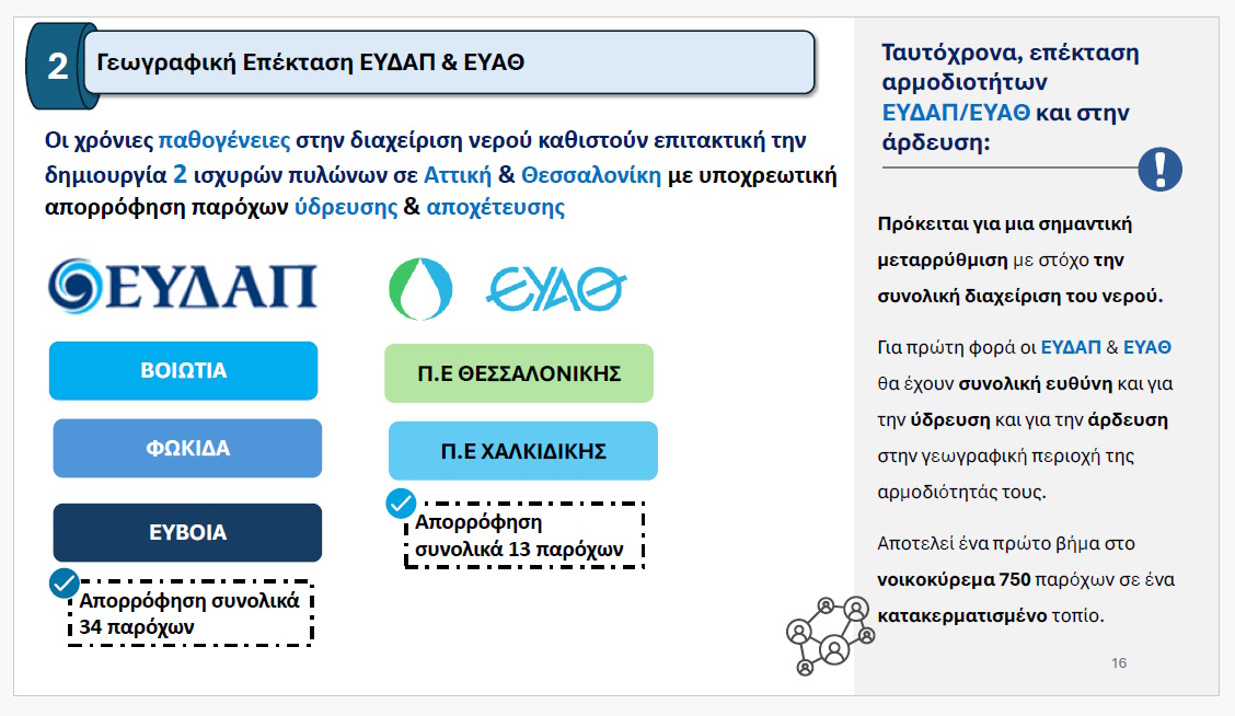 Δημιουργούμε 2 ισχυρούς πυλώνες σε Αττική & Θεσσαλονίκη με υποχρεωτική απορρόφηση παρόχων ύδρευσης & αποχέτευσης.