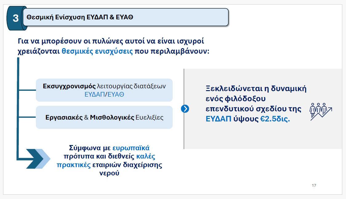 • Εργασιακές και μισθολογικές ευελιξίες, που θα ξεκλειδώσουν τη δυναμική των εταιρειών αυτών, θα προσελκύσουν νέα στελέχη και θα δώσουν τη δυνατότητα στην ΕΥΔΑΠ να εφαρμόσει πλήρως ένα φιλόδοξο επενδυτικό σχέδιο 2,5 δισ.
