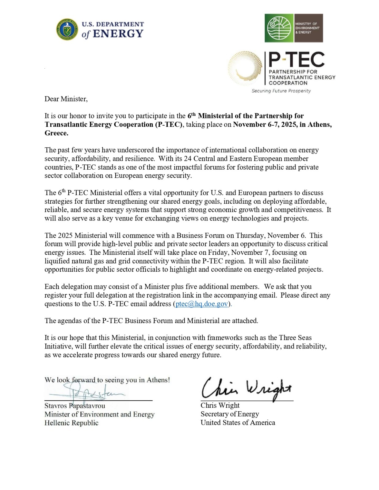 Όπως αναφέρει, η κοινή πρόσκληση που συνυπογράφουν οι κ. Παπασταύρου και Wright και απευθύνεται προς τις 24 ευρωπαϊκές χώρες-μέλη του P-TEC, «η 6η Υπουργική Διάσκεψη P-TEC προσφέρει την ευκαιρία στους εταίρους των ΗΠΑ και της Ευρώπης να συζητήσουν στρατηγικές για την περαιτέρω ενίσχυση των κοινών μας ενεργειακών στόχων, συμπεριλαμβανομένης της ανάπτυξης οικονομικά προσιτών, αξιόπιστων και ασφαλών ενεργειακών συστημάτων που υποστηρίζουν ισχυρή οικονομική ανάπτυξη και ανταγωνιστικότητα. Θα λειτουργήσει επίσης ως βασική πλατφόρμα ανταλλαγής απόψεων για ενεργειακές τεχνολογίες και έργα».