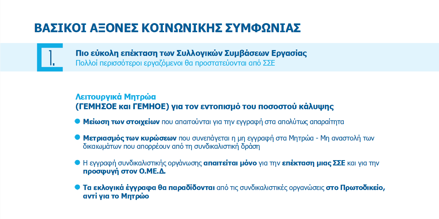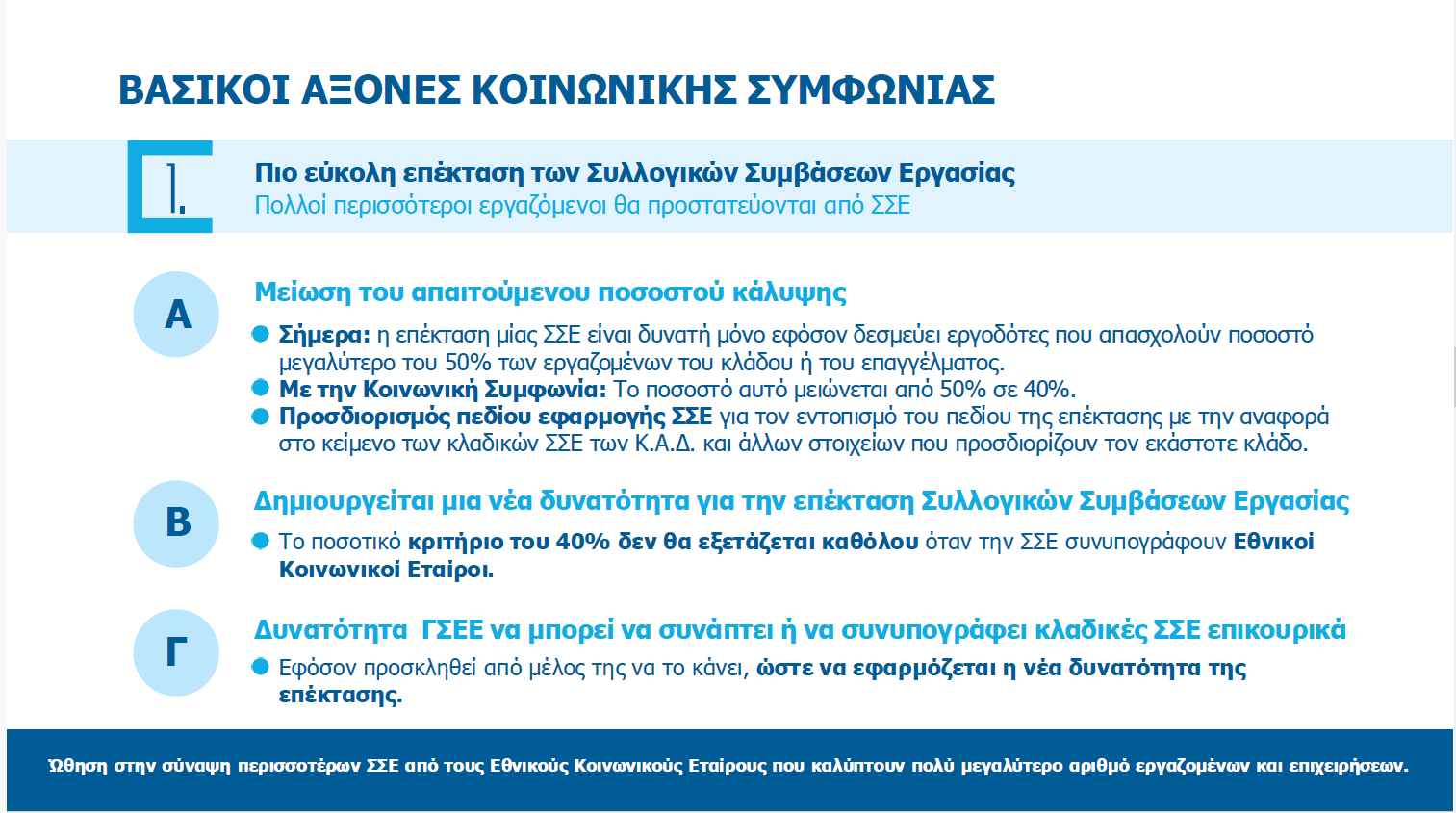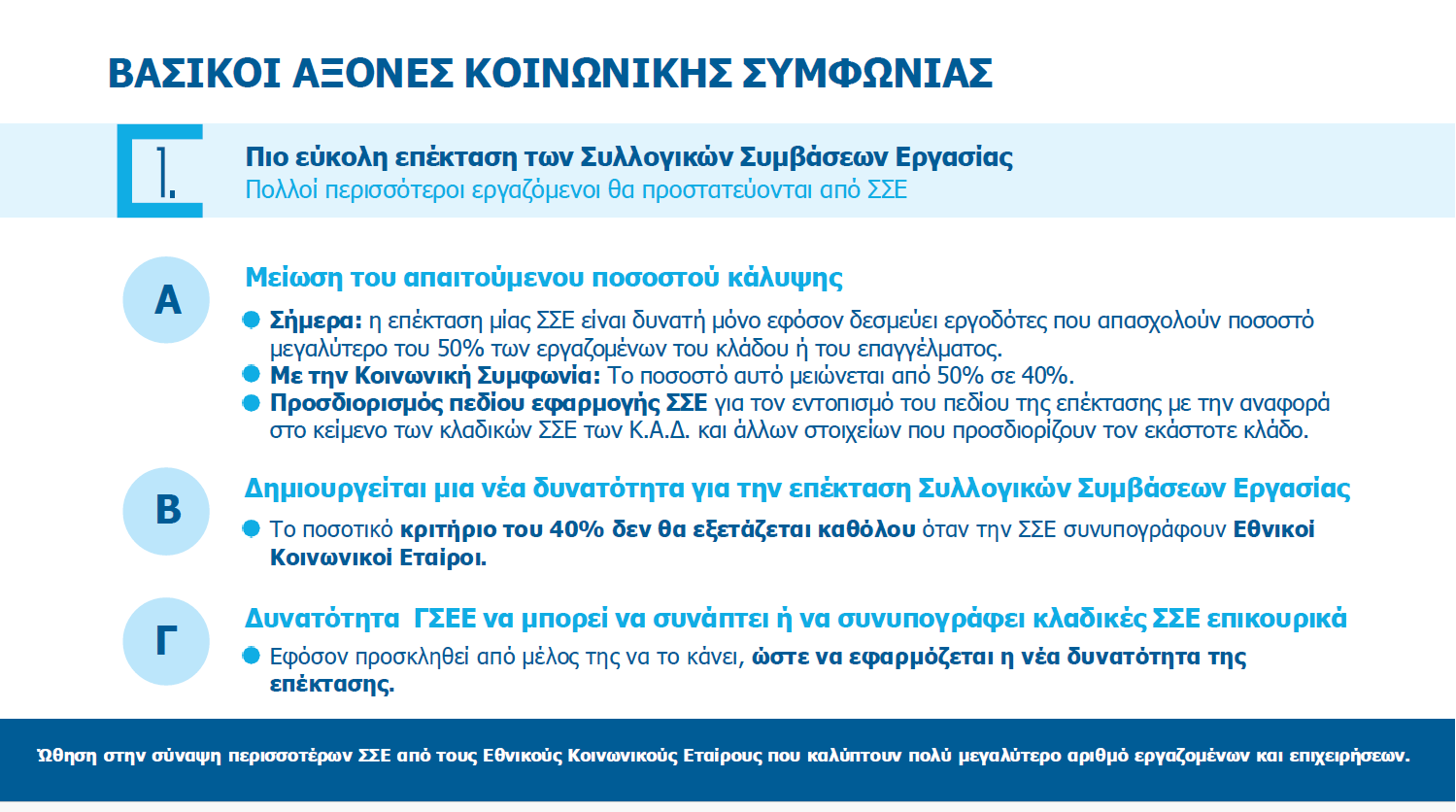 - δημιουργείται νέα δυνατότητα για την επέκταση Συλλογικών Συμβάσεων Εργασίας, καθώς το ποσοτικό κριτήριο του 40% δεν θα εξετάζεται καθόλου όταν τη Συλλογική Σύμβαση Εργασίας συνυπογράφουν Εθνικοί Κοινωνικοί Εταίροι και