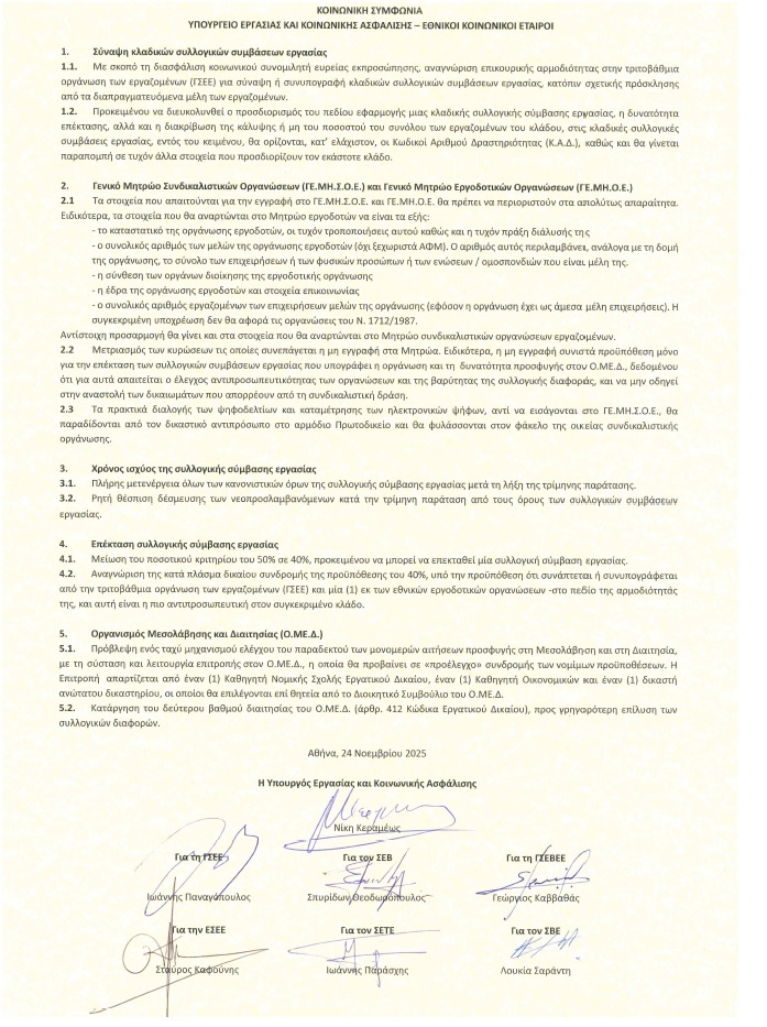 Μείωση του ποσοστού κάλυψης για την υπογραφή κλαδικών συλλογικών συμβάσεων εργασίας, δυνατότητα υπογραφής ακόμα και από τη ΓΣΕΕ και πλήρη μετενέργεια τους προβλέπει η κοινή συμφωνία μεταξύ Υπουργείου Εργασίας και κοινωνικών εταίρων, την οποία παρουσίασαν σήμερα (26.11.25).