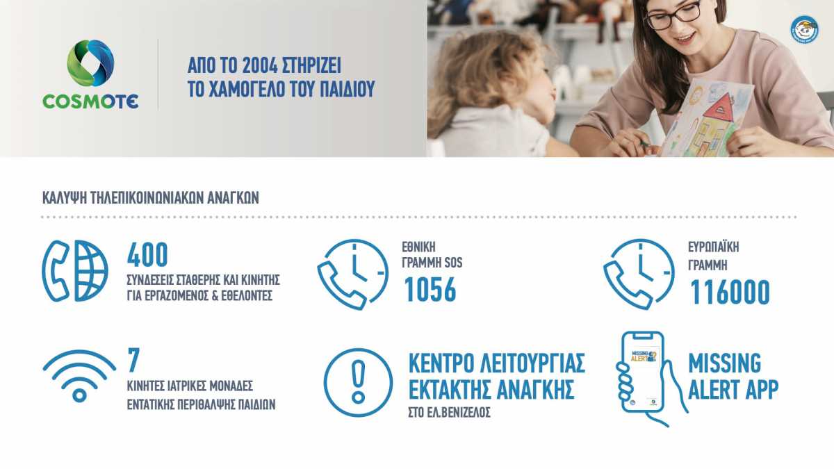 Προηγμένες τεχνολογικές λύσεις και τηλεπικοινωνιακές υπηρεσίες, που διευκολύνουν το έργο του σωματείου για την φροντίδα των παιδιών και την αντιμετώπιση περιστατικών εξαφάνισης στην Ελλάδα προσφέρει η COSMOTE, υποστηρίζοντας εδώ και 17 χρόνια το έργο του Οργανισμού «Το Χαμόγελο του Παιδιού».