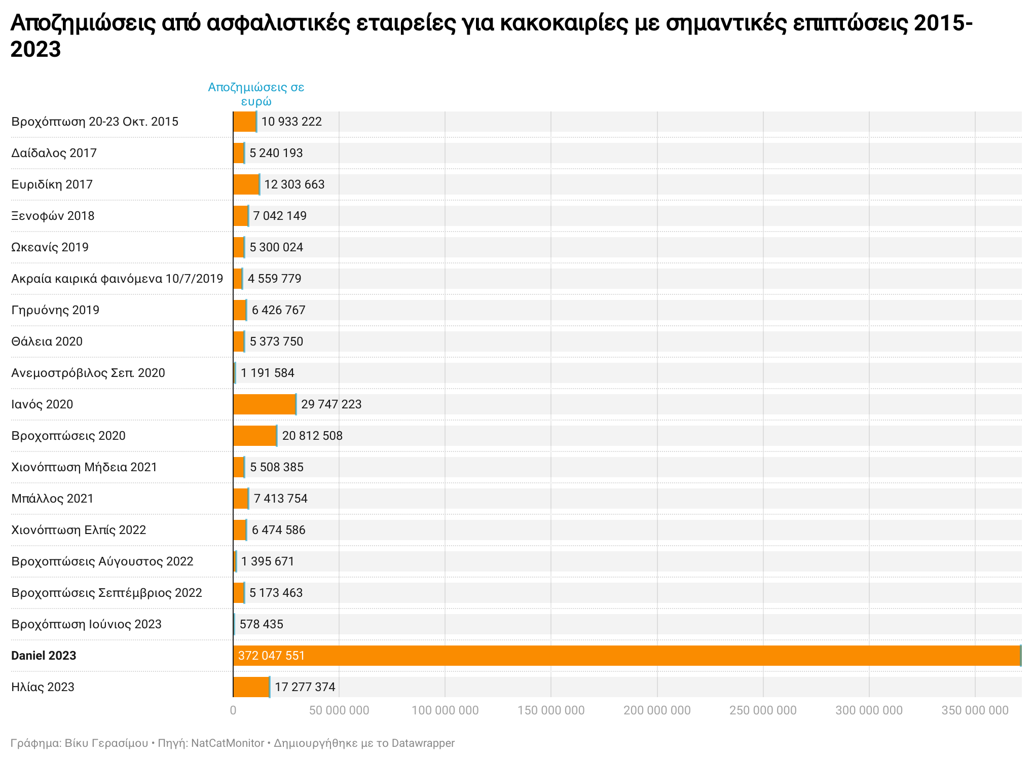Από την κακοκαιρία που έπληξε όλη τη χώρα στις 20-23 Οκτωβρίου του 2015 αφήνοντας πίσω της 3 νεκρούς μέχρι και το Σεπτέμβριο του 2023 που έχουμε την μεγάλη καταστροφή από τις καταιγίδες της κακοκαιρίας Daniel, μόνο οι ασφαλισμένες απώλειες, δηλαδή οι αποζημιώσεις για όσους είχαν ασφαλίσει την περιουσία τους φτάνουν περίπου στα 525 εκατ. ευρώ.