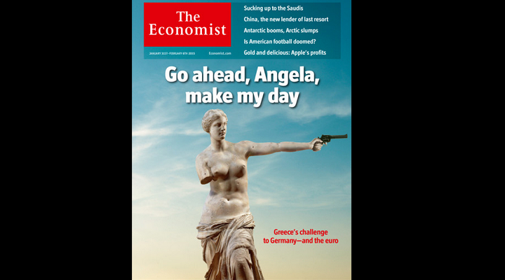 Με ένα εντυπωσιακό σκίτσο που δείχνει την Μέρκελ και τον Τσίπρα να πολεμούν για το ευρώ η Guardian απαντά στο πρωτοσέλιδο του Economist με την Αφροδίτη της Μήλου να απειλεί με όπλο την Γερμανίδα Καγκελάριο.
