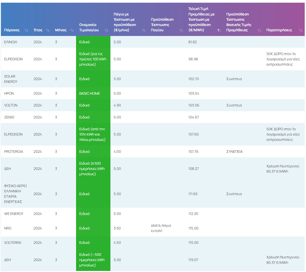 Σημαντικά μειωμένες είναι οι χρεώσεις που ανακοίνωσαν οι προμηθευτές εταιριών ενέργειας για τα «πράσινα» τιμολόγια ρεύματος του Μαρτίου 2024. Οι χρεώσεις στα τιμολόγια ρεύματος ξεκινούν από τα 8,1 σεντς ανά κιλοβατώρα.
