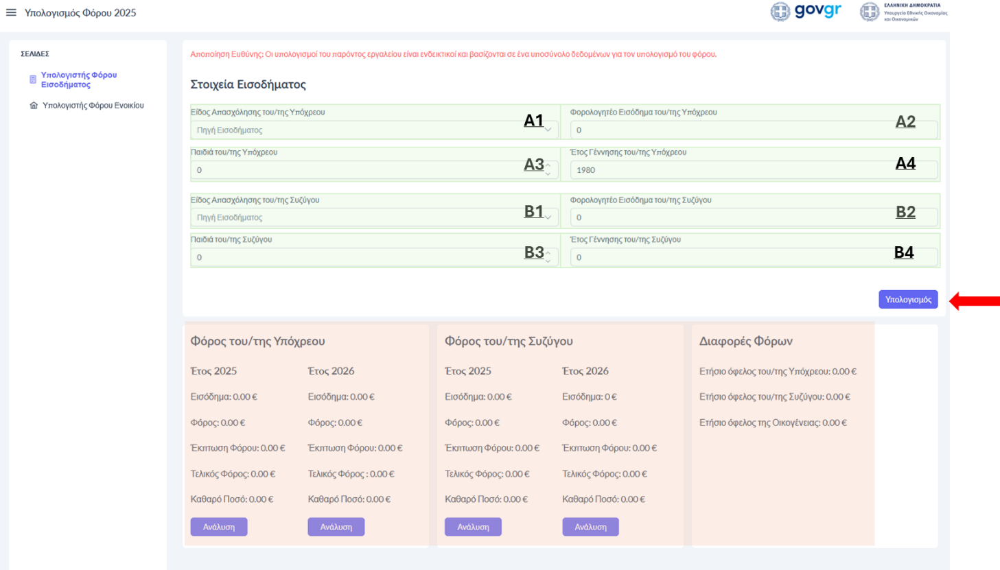 Κάθε πολίτης μπορεί  να επιλέξει τον Υπολογιστή Φόρου Εισοδήματος που εμφανίζεται στην αρχική οθόνη ή τον Υπολογιστή Φόρου Ενοικίου.